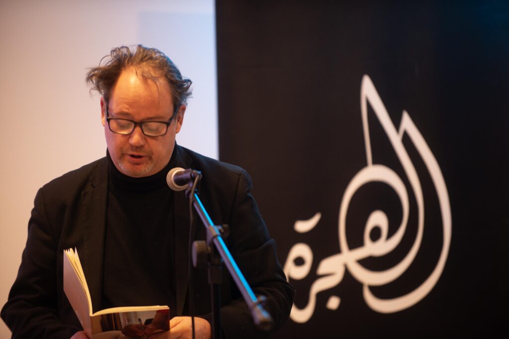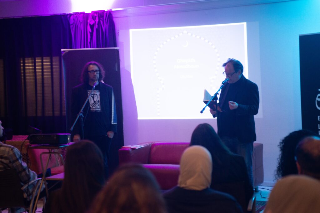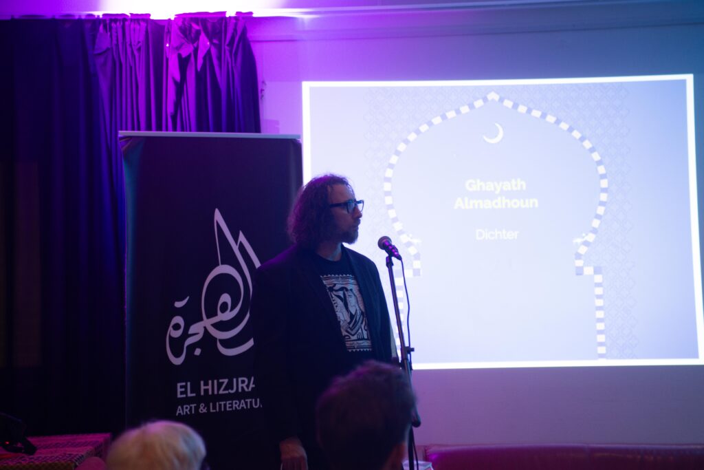 De avond opende zich met het werk van de Palestijnse dichter Ghayath Almadhoun. Het publiek werd welkom geheten door de moderator van de avond Naeeda Aurangzeb en de directeur van El Hizjra Mohamed Mahdi.